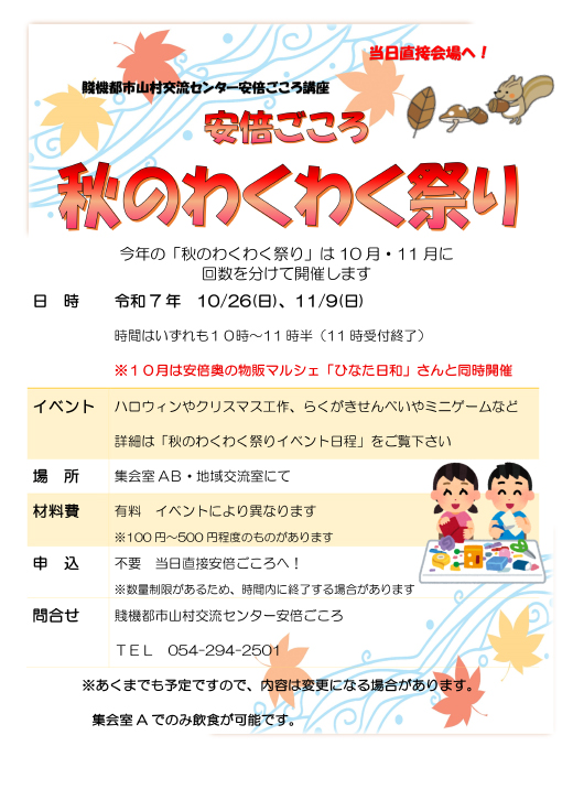 お問い合わせ:静岡市賤機都市山村交流センター 安倍ごころ ☎054(294)2501 |